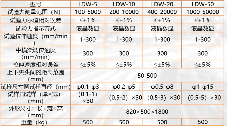 LDS-5/10/20/50微機(jī)控制拉力試驗(yàn)機(jī)主機(jī)為雙立柱落地式結(jié)構(gòu),無須在地基上鉆打絲杠用孔,安裝方便。該機(jī)加載部分采用先進(jìn)的交流伺服電機(jī)和全數(shù)字交流伺服驅(qū)動(dòng)器,試驗(yàn)速度(無極)可調(diào),數(shù)字顯示。